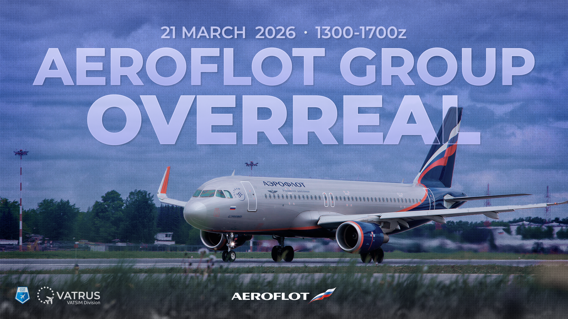 21.03.2026 13:00z-17:00zВ субботу, 21 марта 2026 года, с 13:00z до 17:00z, Региональный центр Екатеринбург совместно с Aeroflot Virtual Airlines в сети VATSIM приглашает вас принять участие в мероприятии Aeroflot Group Overreal.